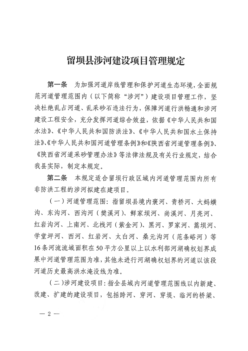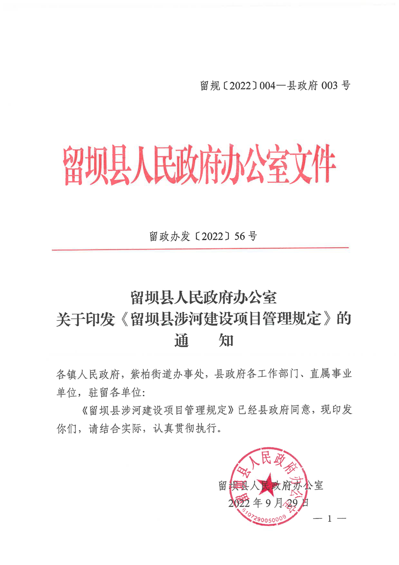 留壩縣人民政府辦公室關(guān)于印發(fā)留壩縣涉河建設(shè)項(xiàng)目管理規(guī)定的通知