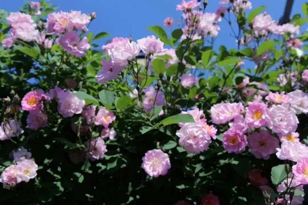 廳城路上高高的城墻,隨處可見一簇簇薔薇花爬滿墻頭,悄然靜靜地綻放她的美麗。她們或粉或紅,或白或紫,個個是那樣的柔弱,卻又是那樣的堅韌,在陽光的照耀下嬌艷綻放,散發著淡淡的清香。