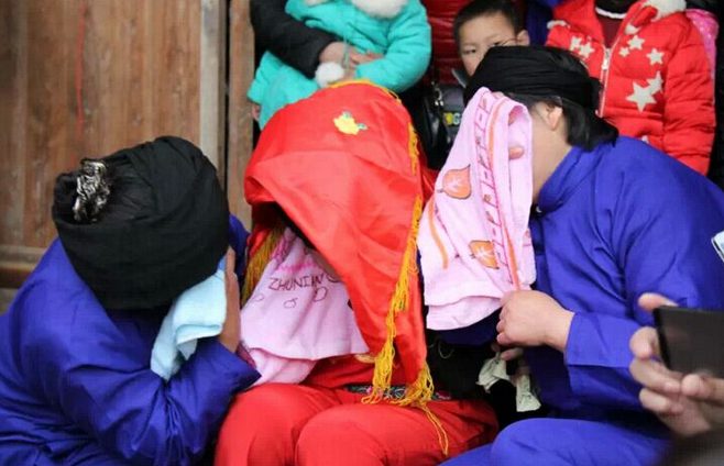 當娶親的催新娘上轎時, 新娘的哥哥 (房族哥也可) 從新娘的睡房背上新娘到堂屋 (客廳) , 堂屋神龕前的地面鋪上席子, 席子上用斗裝滿糧食, 糧食中插上 12 雙筷子, 新娘背出后先面對神龕跪拜祖先, 再跪拜爺婆父母, 然后站在斗梁上, 分別抽出一雙雙筷子向東南西北扔, 邊扔邊說: 爺婆撿起福壽長, 爸媽撿起萬擔糧, 哥嫂撿起開錢莊, 姐姐撿起家道旺, 妹妹撿起攢私房, 兄弟撿起說媳婦, 弟媳賢惠又漂亮……當哥哥預背妹妹出門上轎時, 新娘就開始哭唱。 現舉幾段供鑒賞: 往天哥背走人戶, 今天哥背離爹娘。 往天走親三五天, 今天離家萬萬年。 在家總是千般好, 出門又是一層天……當娶親人催新娘上轎時, 母親又哭起來, 現舉一段供鑒賞: 樹木長大要分丫, 女生外相放婆家。 女長十八一枝花, 花開結子要發芽。 為娘受盡千般苦, 才將冤孽盤養大。 懷胎十月苦受盡, 不思茶飯路難行。 兒奔生來母奔死, 只隔閻羅一層紙。 生下一尺零五寸, 娘奶喂你睜眼睛。 女是娘的心尖肉, 抱在懷里勝千金。怕餓怕渴怕熱冷, 生怕得病操碎心。尿濕左邊放右邊, 尿濕右邊放左邊。左右兩面都濕遍, 把你放在娘胸前……眼看閨女長成人, 教你茶飯拿繡針。 成為娘的左右手, 如今將成外姓人。 男大當婚女當嫁, 婆家不比娘家親。爹娘無能陪嫁少, 萬貫家產靠自掙。清晨早起掃房院, 說話做事要勤謹。孝敬公婆和公爹, 夫妻恩愛互照應……