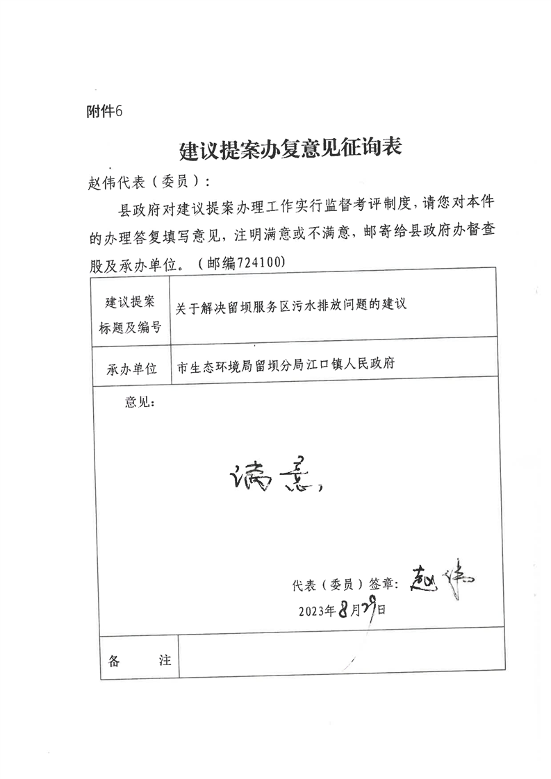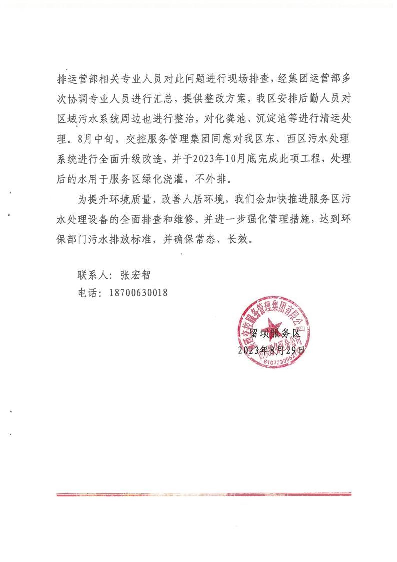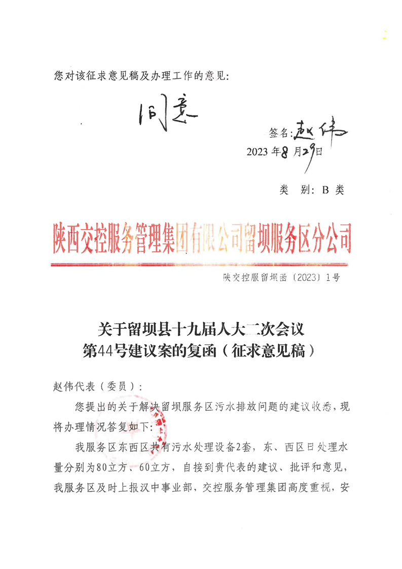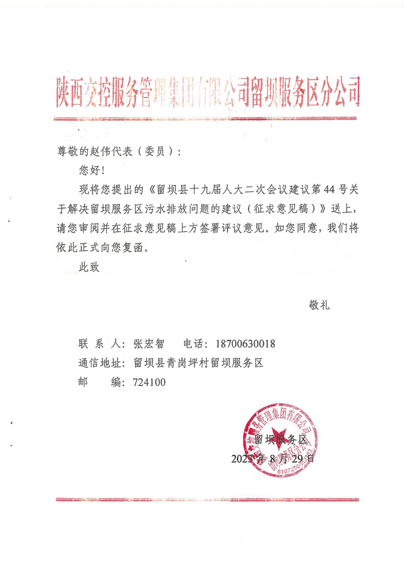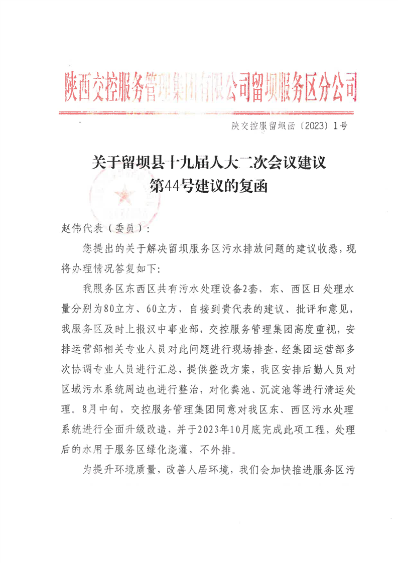 陜西交控服務管理集團有限公司留壩服務區分公司留壩縣十九屆人大二次會議建議第44號關于解決留壩服務區污水排放問題的建議的復函