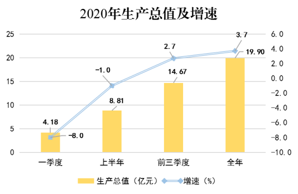 初步核算,全年實現生產總值19.90億元,同比增長3.7%。其中,第一產業增加值3.86億元,同比增長4.5%;第二產業增加值4.41億元,同比增長8.6%;第三產業增加值11.63億元,同比增長1.7%。非公有制經濟增加值占生產總值比重為51.83%。
