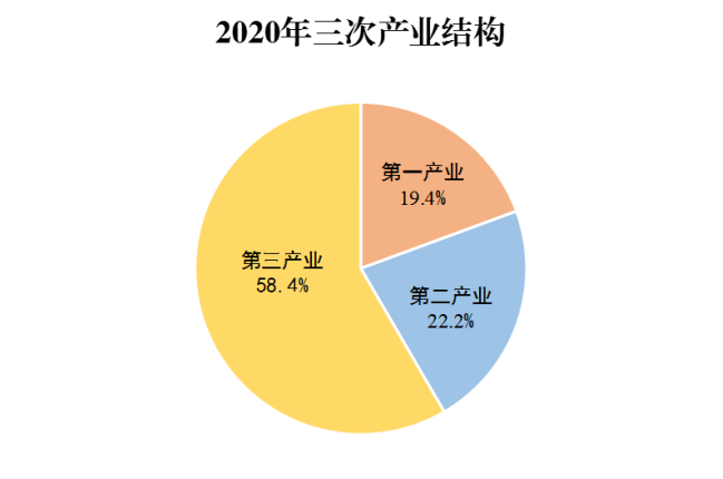 生產總值中,第一、第二和第三產業增加值占比分別為19.4%、22.2%和58.4%。與2019年相比,第一產業增加值占比提高1.6個百分點,第二產業、第三產業增加值占比分別下降1.2個、0.4個百分點。