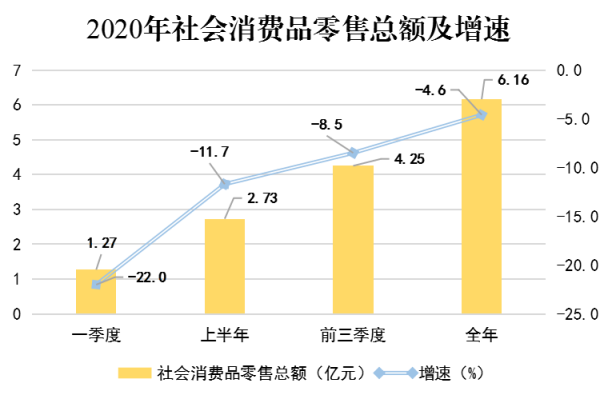 全年實現社會消費品零售總額6.16億元,同比下降4.6%。其中,限上單位實現消費品零售額4.21億元,同比增長9.5%,占比為68.3%。按經營單位所在地分,城鎮消費品零售額4.44億元,同比下降4.9 %;鄉村消費品零售額1.73億元,同比下降3.9%。按消費形態分,餐飲收入1.78億元,同比下降4.0%;商品零售額4.38億元,同比下降4.9%。