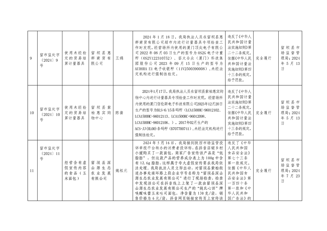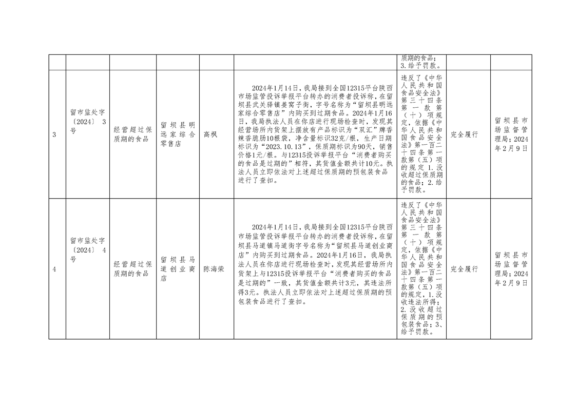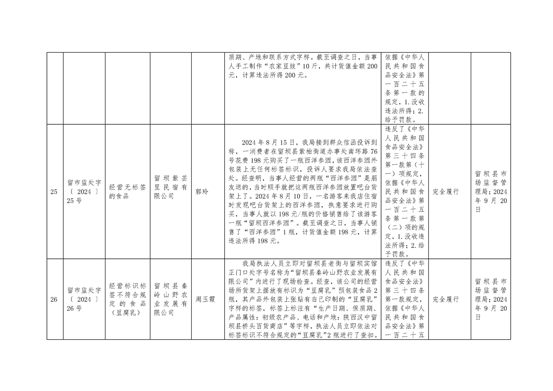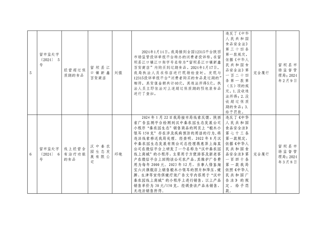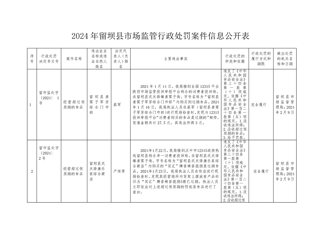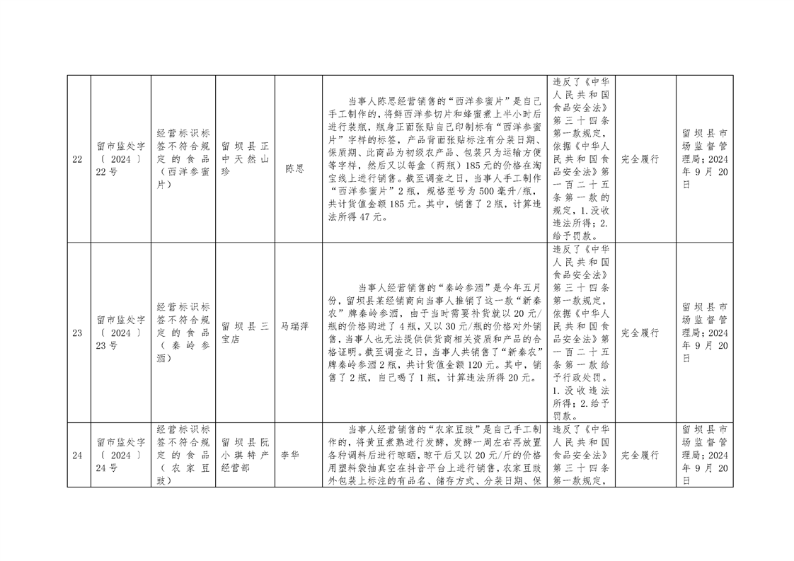 2024年留壩縣市場監管行政處罰案件信息公開表