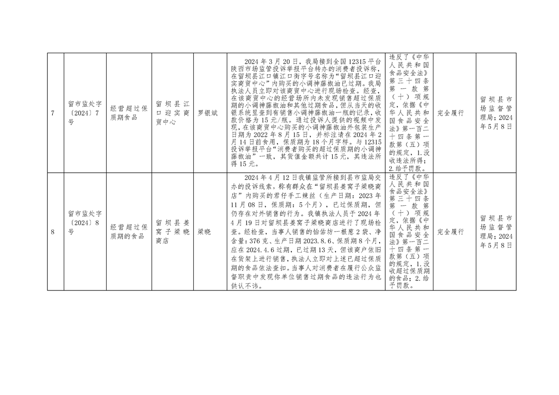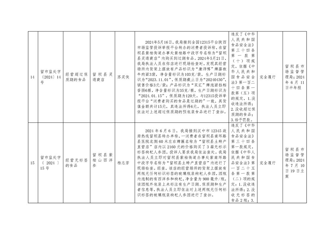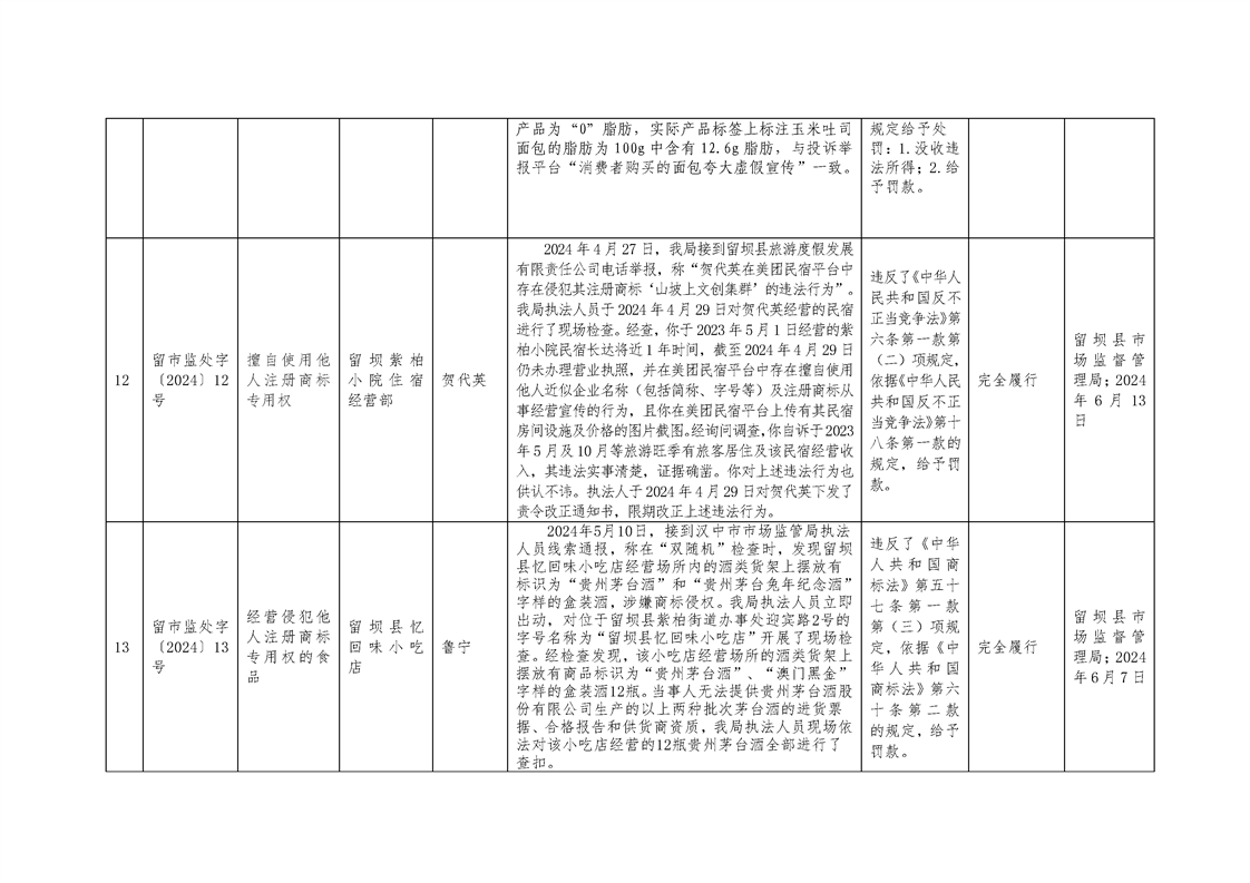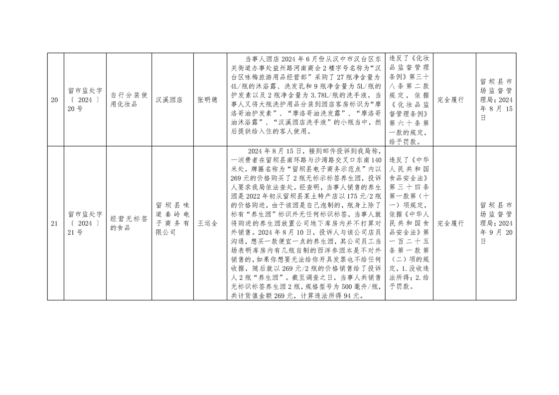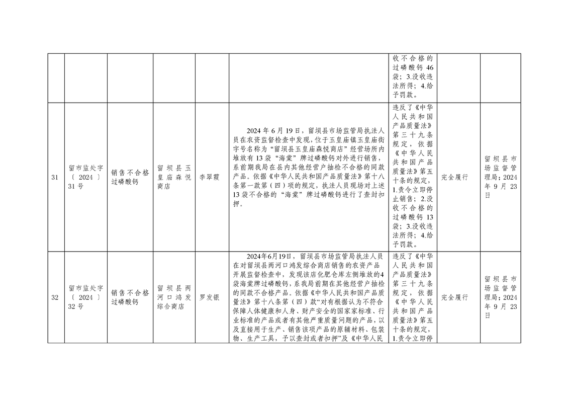 2024年留壩縣市場監管行政處罰案件信息公開表
