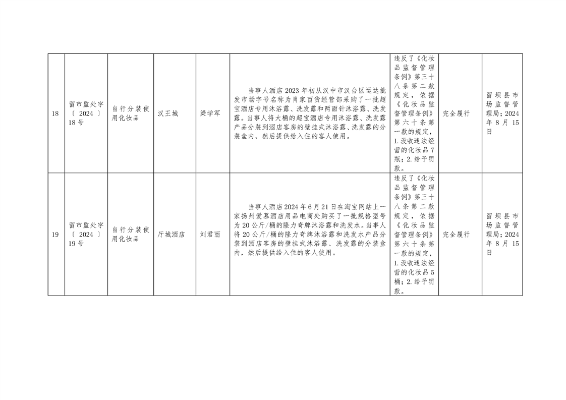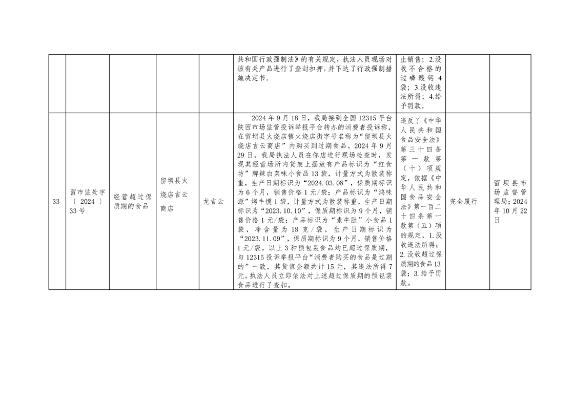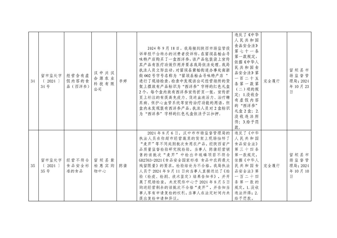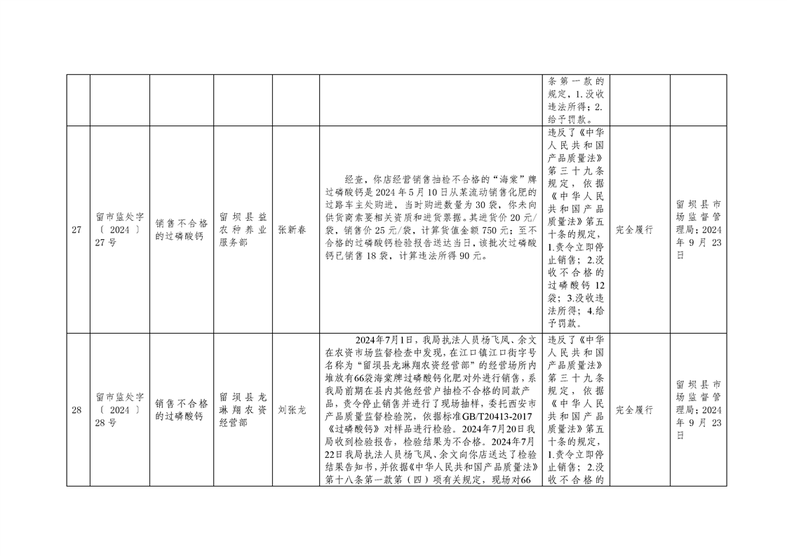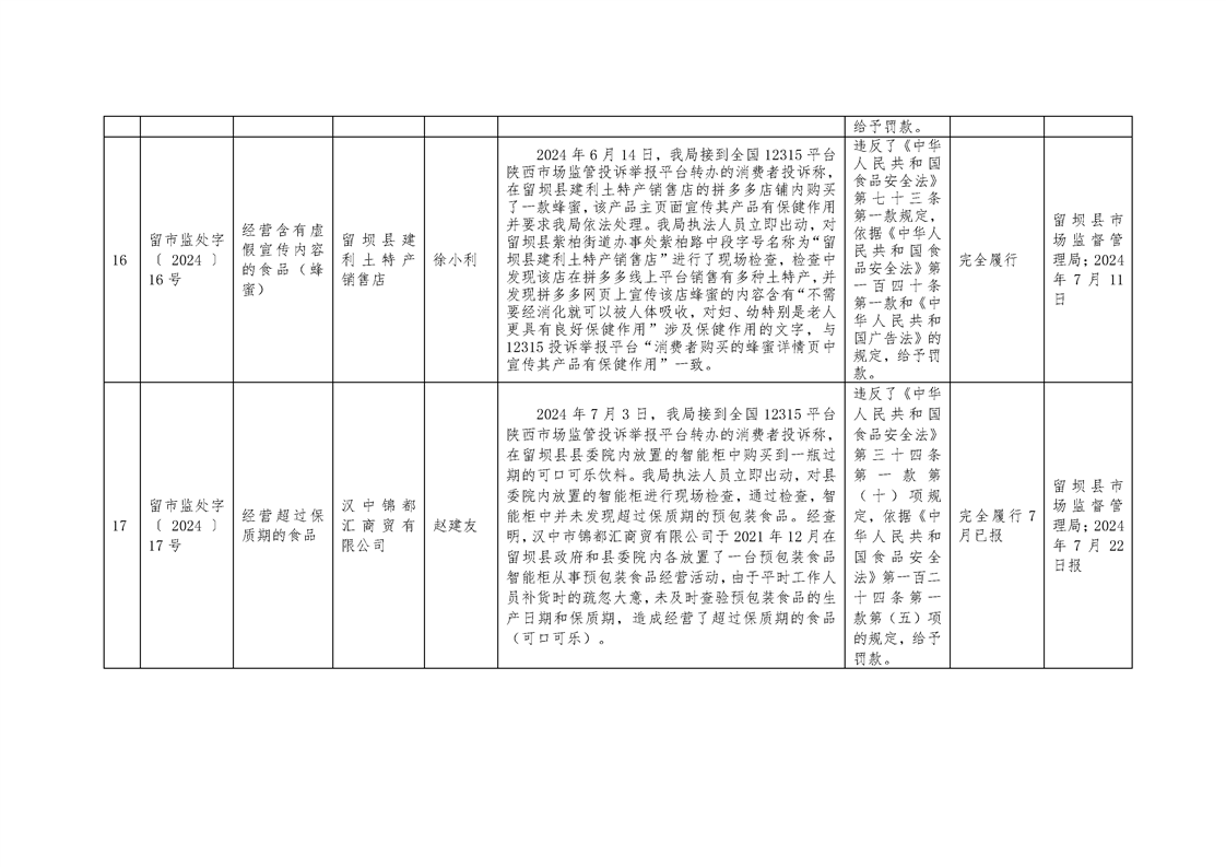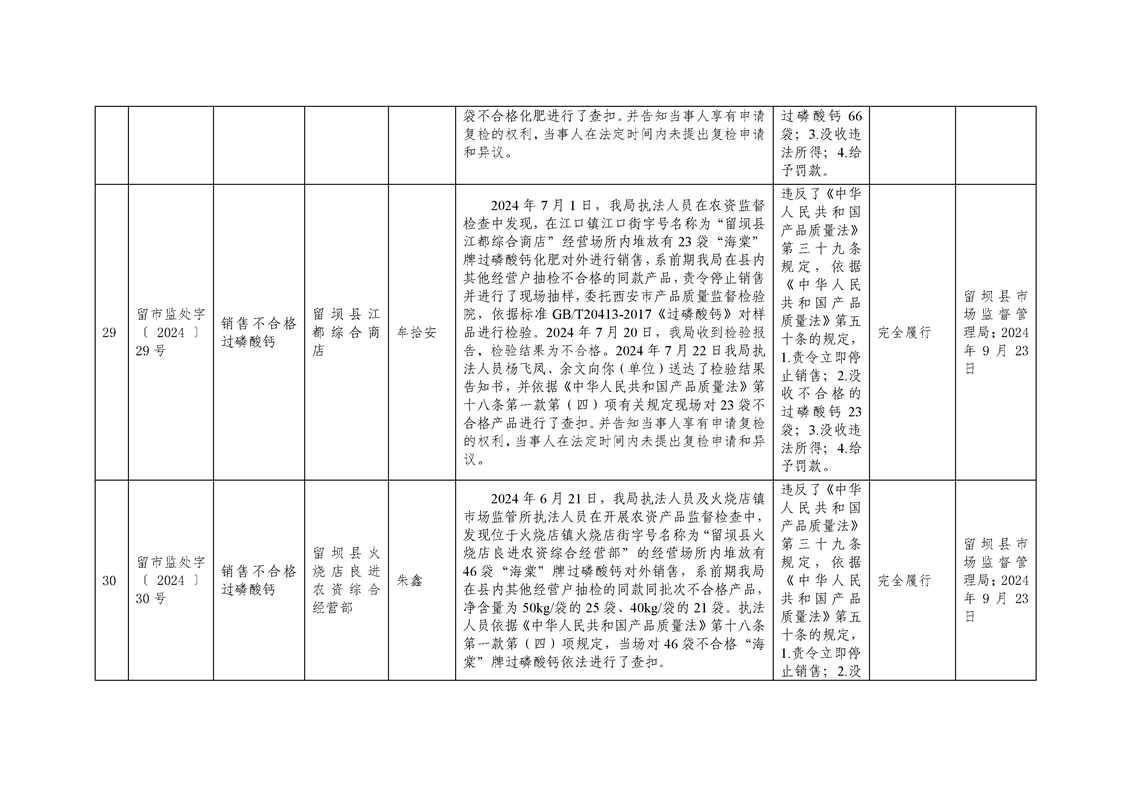 2024年留壩縣市場監管行政處罰案件信息公開表