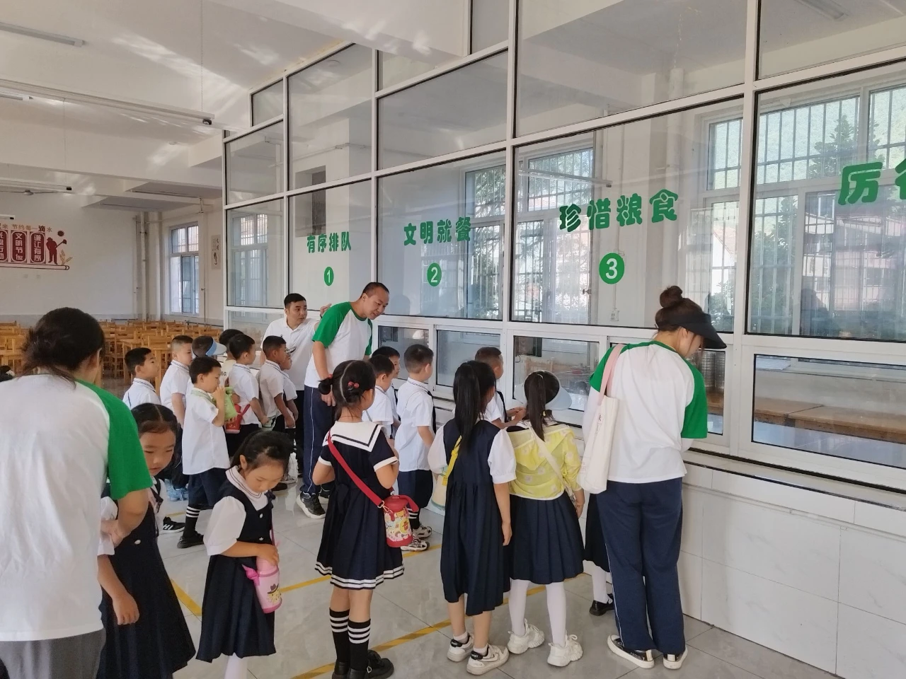 馬瑩老師作為向?qū)ьI(lǐng)孩子們參觀了校園。在餐廳樓,孩子們在老師的組織下模擬體驗(yàn)了用餐,開展了禮儀教育和節(jié)約糧食教育;在部室樓,孩子們對計(jì)算機(jī)教室、舞蹈教室、大隊(duì)部、科技室、實(shí)驗(yàn)室都充滿了好奇,老師們不斷解答著孩子們的疑惑;此外老師們還就飲水機(jī)如何接水、如何有序如廁這些細(xì)節(jié)問題向孩子們進(jìn)行了講解。